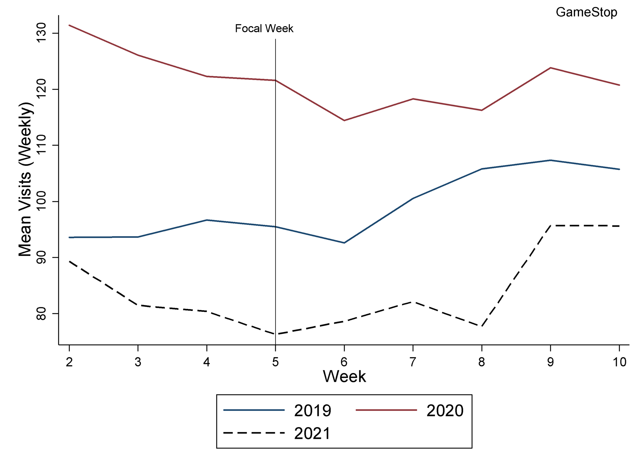 I further compare the year-over-year-over-year (i.e., 2019, 2020 and 2021) differences in mean store visits in the first 9 weeks of each year. The analysis starts from the second week of each year up to week ten. As indicated, the focal week (hype week) was week 5 (starting from January 25, 2021).